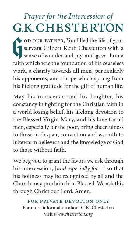 Thank you for joining us in prayer for the intercession of G.K. Chesterton. Please provide your mailing information below and we will send you a pack of ten prayer cards at no cost. Please contact us for higher quantities.