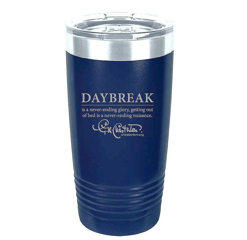 Polar Camel 20 oz. Navy Blue Ringneck Vacuum Insulated Tumbler w/Clear Lid. Stainless steel engraved with the quotation “Daybreak is a never-ending glory, getting out of bed is a never-ending nuisance.” – G.K. Chesterton